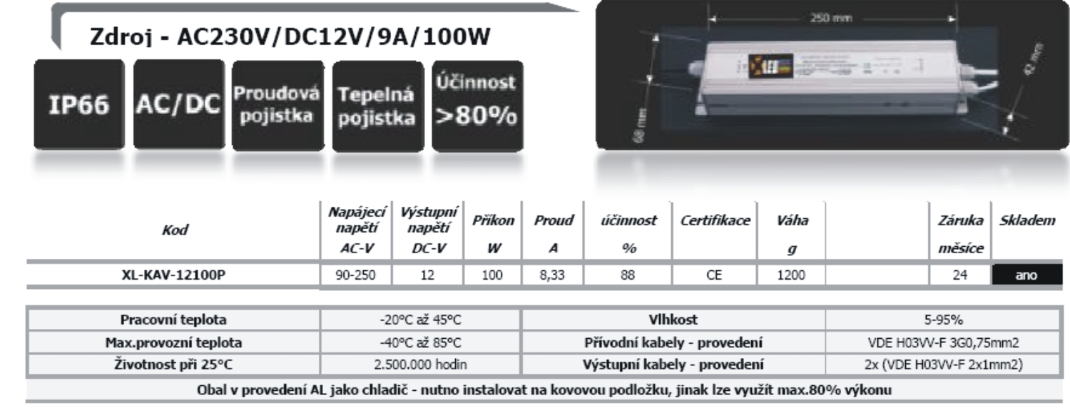 Zdroj - AC230V/DC12V/9A/100W   Stabilzovaný zdroj sloužící k napájení LED didových světelných zdrojů DC24V pro venkovní i vnitřní použití IP66.  celý popis